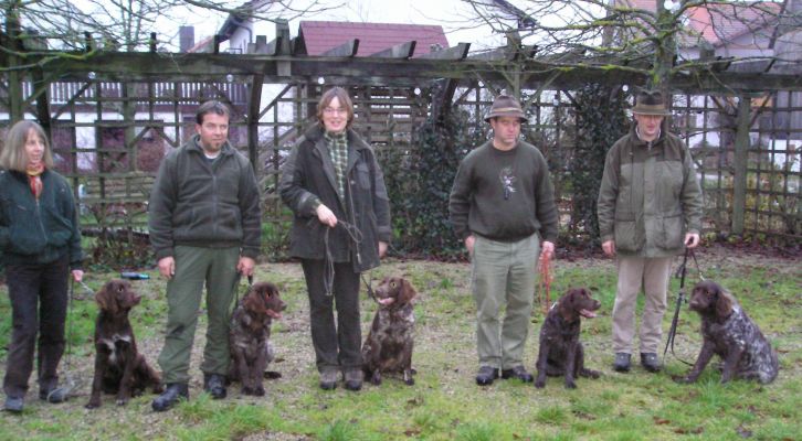 Von links: Drauf, Dina, Dahlia (genannt Berta), Daika und Drago vom Rodekopp, 7 Monate alt. Drauf und Drago leben in der Umgebung von Regensburg, Daika unweit von Erding bei München, Dina in Südtirol und Berta wollte zurück zu den Wurzeln ihres Züchters: ins Saarland. Führer von links: Ursula Habereder, Alfred Alber, Silvia Becker, Hans Eder, Thomas Ashauer.